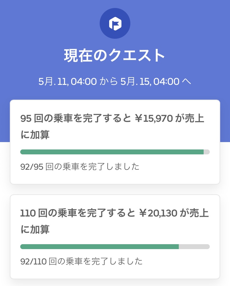 上記のクエストが出ており、あと3回配達で1段目の¥15,970のクエストが完了でした。