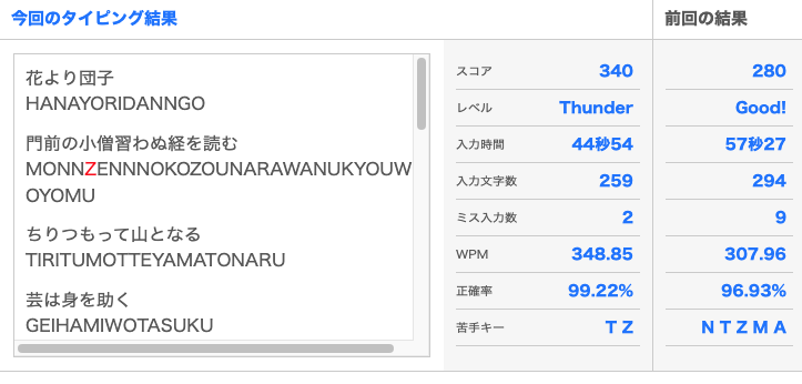 まぁめちゃくちゃたまたまスコアが高かっただけですが、e-typingでとうとうスコア340代が出せました。