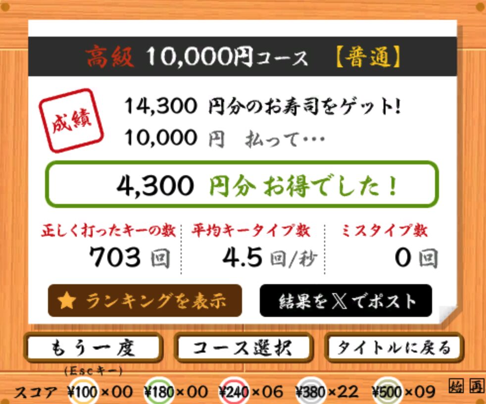 寿司打でもこないだ久しぶりにノーミスでチャレンジして、クリアしました。