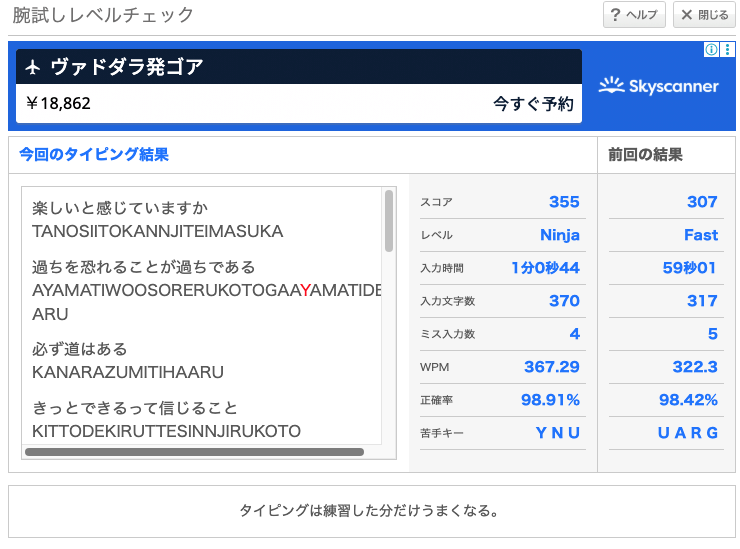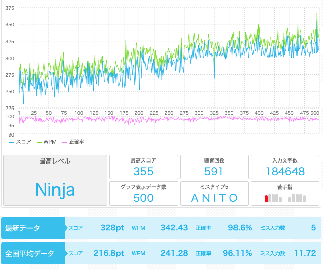 もうタイピングの練習をし始めてから、1年が経ってしまいましたが、ようやくいいスコアになってきました!