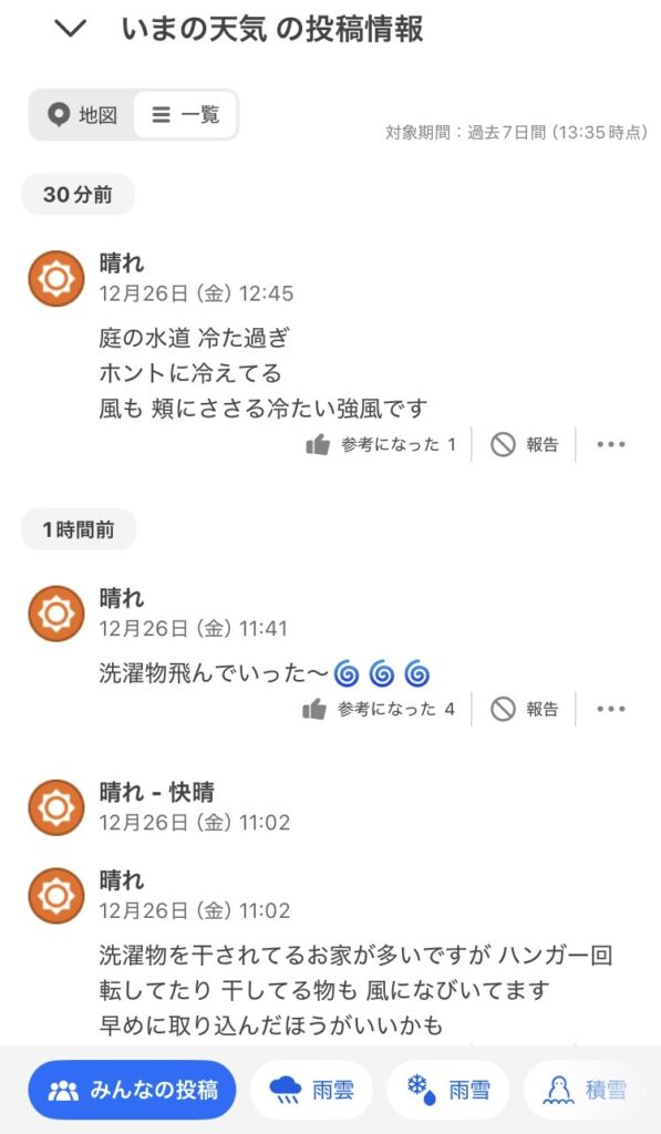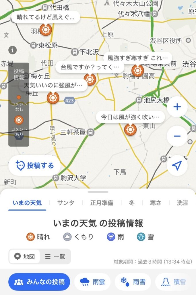 自分の地域の天気を投稿できて、一緒にコメントを投稿できるのですが、完全匿名制で、自由に投稿できるため、見ていてめちゃくちゃ面白いです。